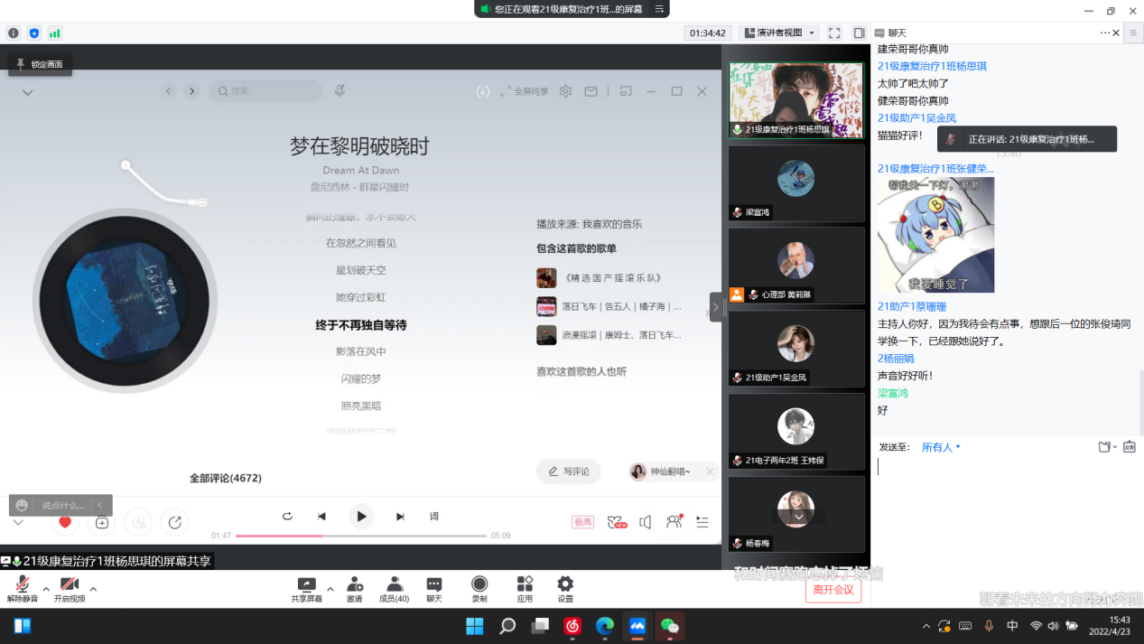 杨思琪同学分享了盘尼西林的《梦在黎明破晓时》,她提到“音乐里有来自星空与黎明的温柔,有当“星划过天空,她穿过彩虹”的浪漫,有闪耀的梦,和温暖的祝福。这首歌的调调很舒服,很适合学习或者独处的时候听。”