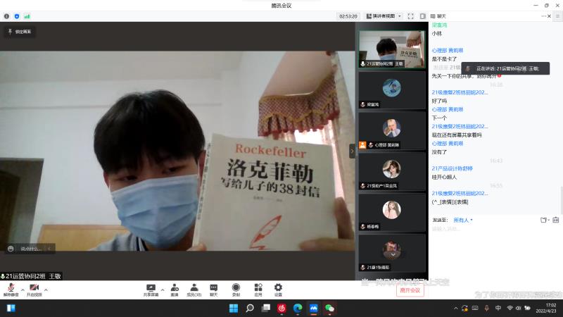 张倩茹同学在分享《洛克菲勒写给儿子的38封信》时提到,整本书都体现了洛克菲勒对他儿子的激励,但同时也对我们有一定的启示,“失败有它的杀伤力,它会打击人的意志力,使人变得萎靡。但最重要的是你对待失败的态度。”